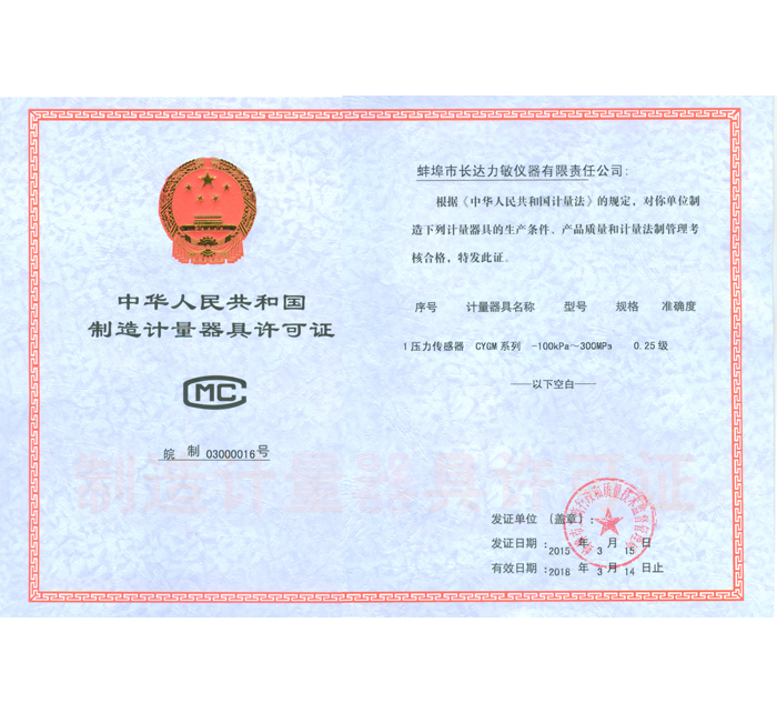 壓力傳感器-制造計量器具許可證